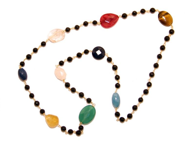 Dekoration mit Halbedelsteinen. Onyx Halskette mit verschiedenen Steinen. Vergoldetes Silber.