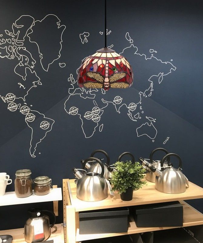 In seiner magischen Welt der Schönheit präsentieren wir einen prächtigen Lampenschirm mit verkrusteten Libellen. Klassische blaue Libellen, die von der Decke hängen. Auf unserer Website finden Sie verschiedene Ausführungen (Hängeleuchten, Wandleuchten, ....) und Größen mit denselben Motiven und Farben.