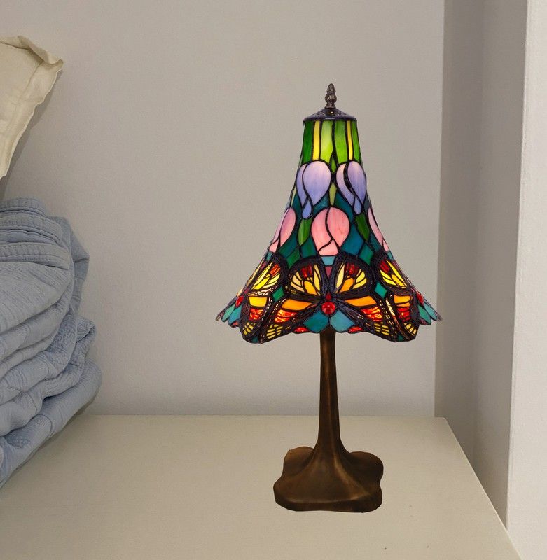 LESSER TABLE BUTTERFLY SERIES Durchmesser 25 cm Höhe 46 cm Lampenschirm: Durchmesser 25 cm Höhe 25 cm 1xE14 MAX.60W Ermöglicht und empfiehlt LED-Glühbirne. Ideal für Nachttische und Dekoration. Viele Farben, mehrfarbig, ein wahres Mosaik aus Licht und Farbe. Tiffany-Glasopale