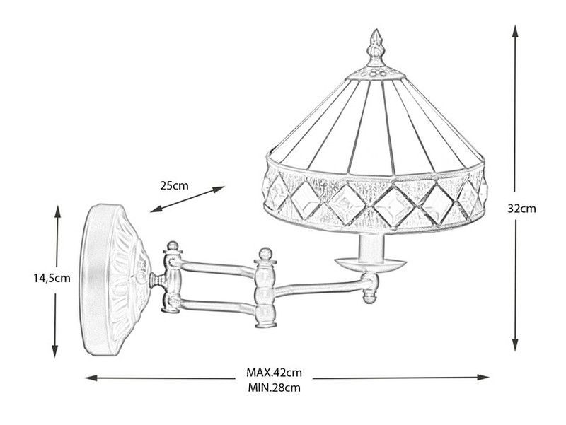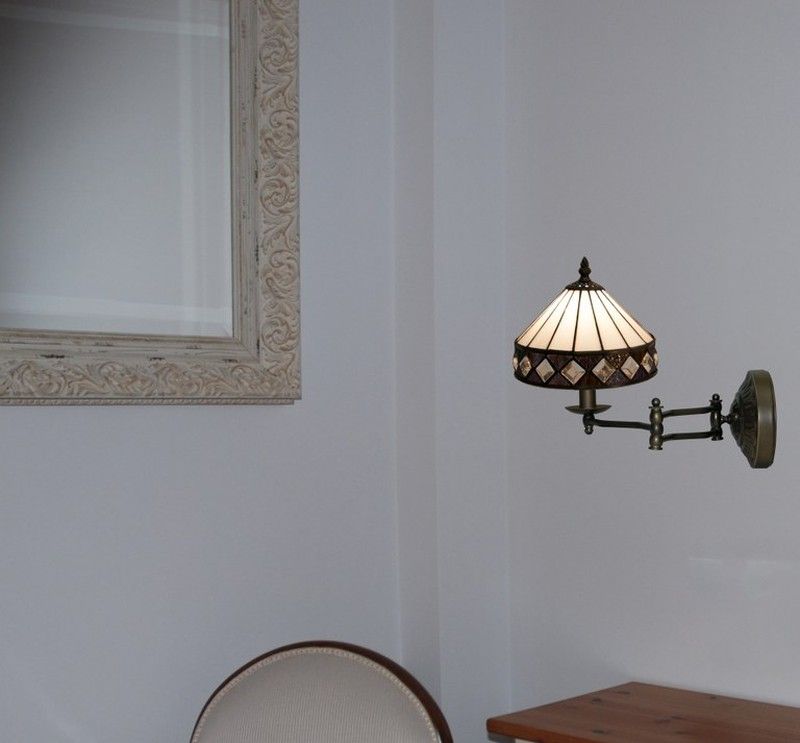Mobile Wandleuchte mit Tiffany-Lampenschirm in hellen Tönen und geometrischen Motiven. Diese Wandleuchte lässt sich in alle Arten von Umgebungen integrieren, besonders geeignet für Schlafzimmerkopfteile.